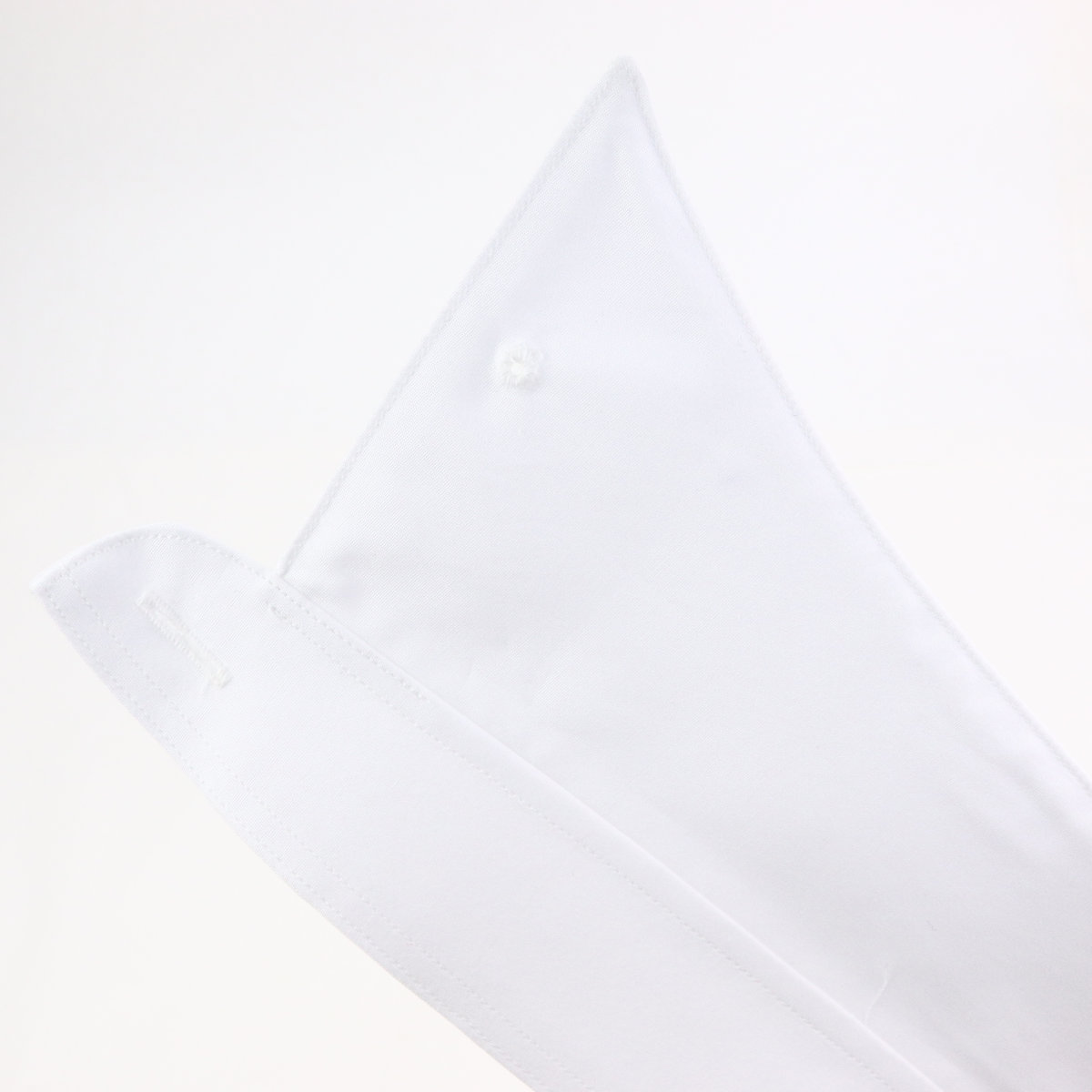 | 衿型 | ピンホールカラー(カラーピン付属)/コバステッチ いまや希少な衿型になってしまった「ピンホールカラー」、ネクタイを締めた後、ノットの下に付属のピンを通すことにより、結び目を持ち上げる効果があります。 剣先:約9cm 衿越:約4cm |
