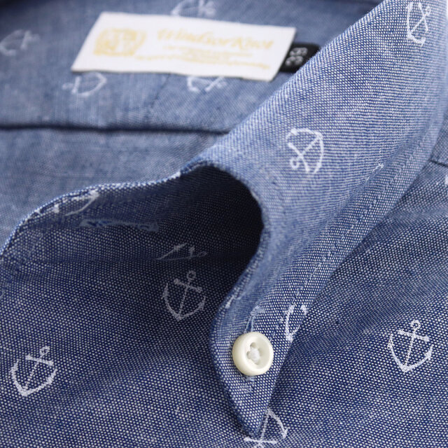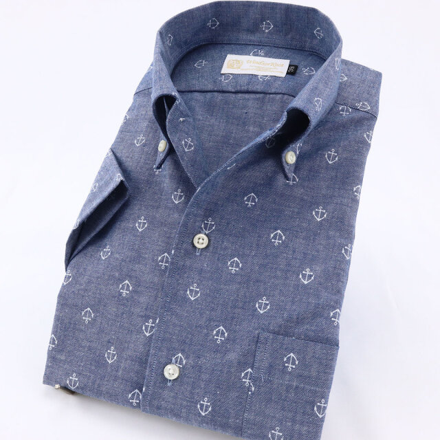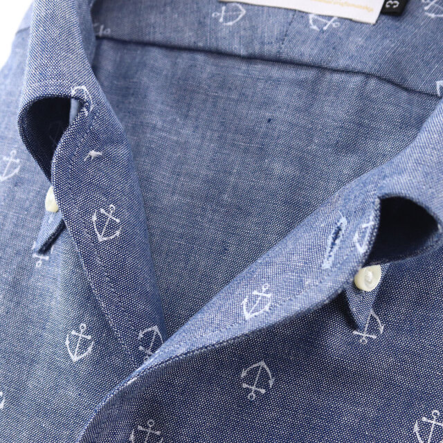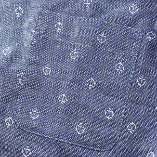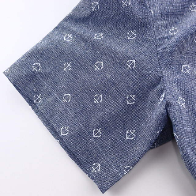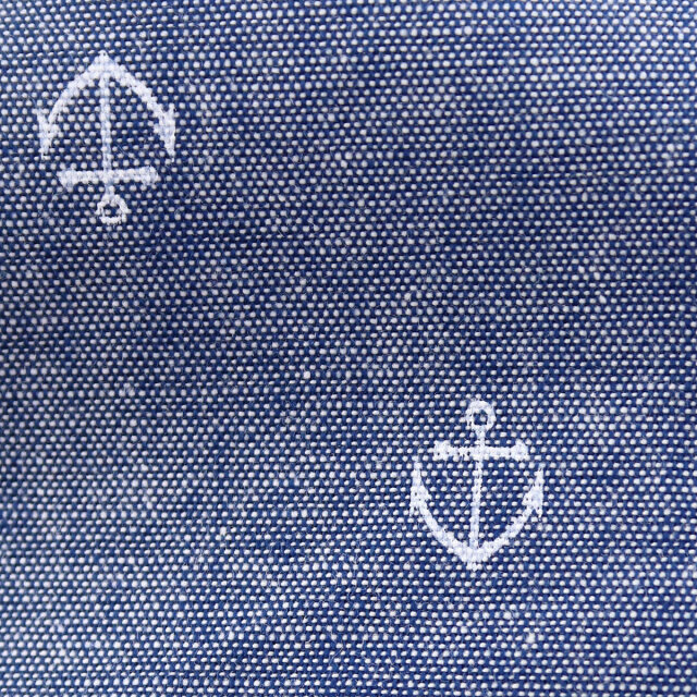 | 素材特徴 | 錨(いかり)プリントを施したダンガリー生地を使用。 奥行きのある色ムラが織り成すナチュラルな風合いが魅力です。 ダンガリーは、元々ワークウェアに使われていたため、丈夫さも兼ね備えています。また、デニムに比べて薄地なので通気性が良く、軽やかで快適な着心地です。 |
