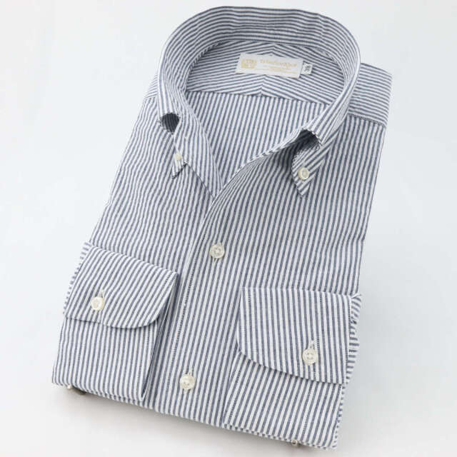 | 商品特徴 | 「シアサッカーのスタイリッシュなアンタイドシャツ」 夏の定番素材シアサッカー生地を使ったボタンダウンシャツです。 通常のボタンダウンと違い、ノーネクタイに特化したワンピースカラー仕立てなので、第一釦を開けると襟元に美しいロールが生まれ、立体的でスタイリッシュな印象に。 加えて、ネイビーストライプの持つ品格とシアサッカー素材の清涼感が、爽やかで好印象なアンタイドスタイルを演出します。 夏のオフィスカジュアルにもおすすめです。 |
