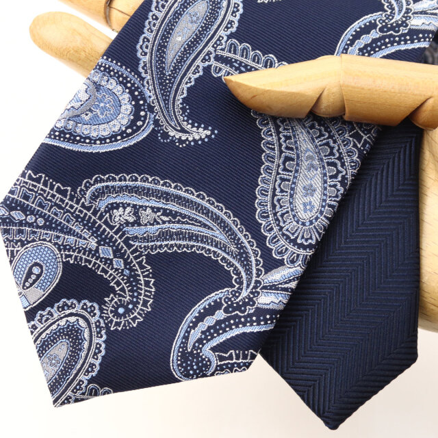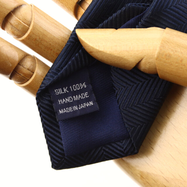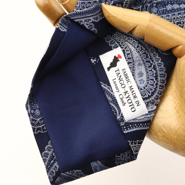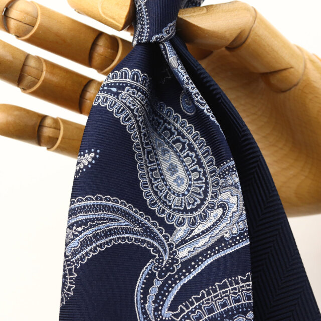 | 素材特徴 | 大剣:ネイビー(ペイズリー) 小剣:ネイビー(ヘリンボーン無地) 光沢が美しい特注の最高級シルク糸を使い、京都丹後地区の旧式レピア織機でゆっくりと織り上げたこだわりの国産生地。 一般的な高速織機で織る平面的な生地と比べ、独特なハリとコシを持ち、ふっくらとした独自の風合いが魅力です。 締めやすく陰影の美しいディンプルが堪能できます。 |