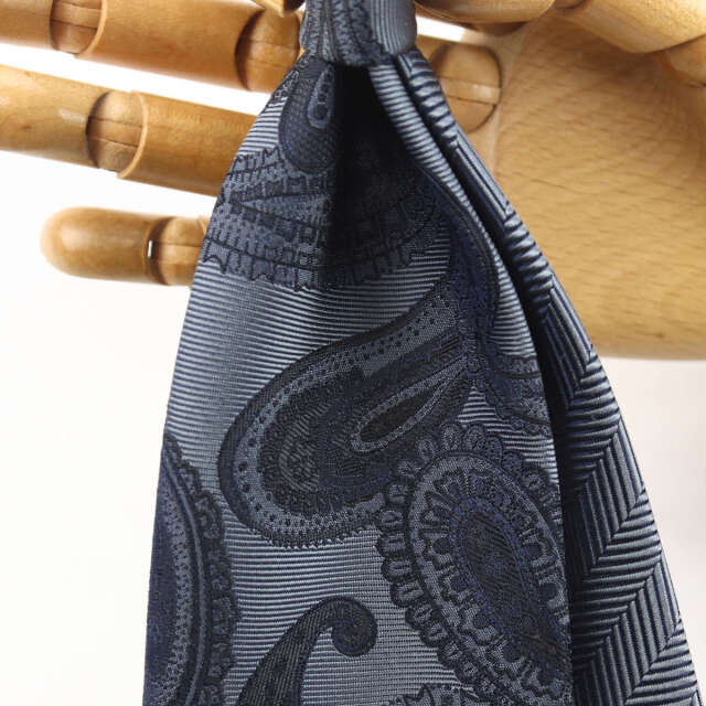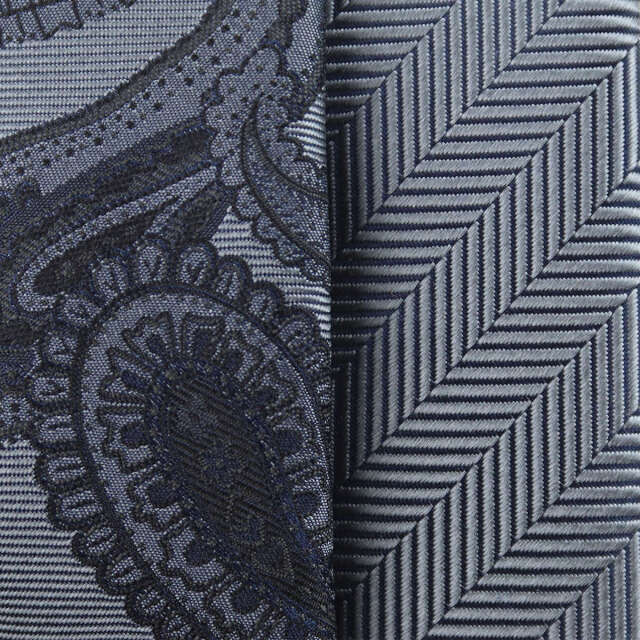 | 素材特徴 | 大剣:ミディアムグレー(ペイズリー) 小剣:ミディアムグレー(ヘリンボーン無地) 光沢が美しい特注の最高級シルク糸を使い、京都丹後地区の旧式レピア織機でゆっくりと織り上げたこだわりの国産生地。 一般的な高速織機で織る平面的な生地と比べ、独特なハリとコシを持ち、ふっくらとした独自の風合いが魅力です。 締めやすく陰影の美しいディンプルが堪能できます。 |