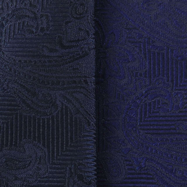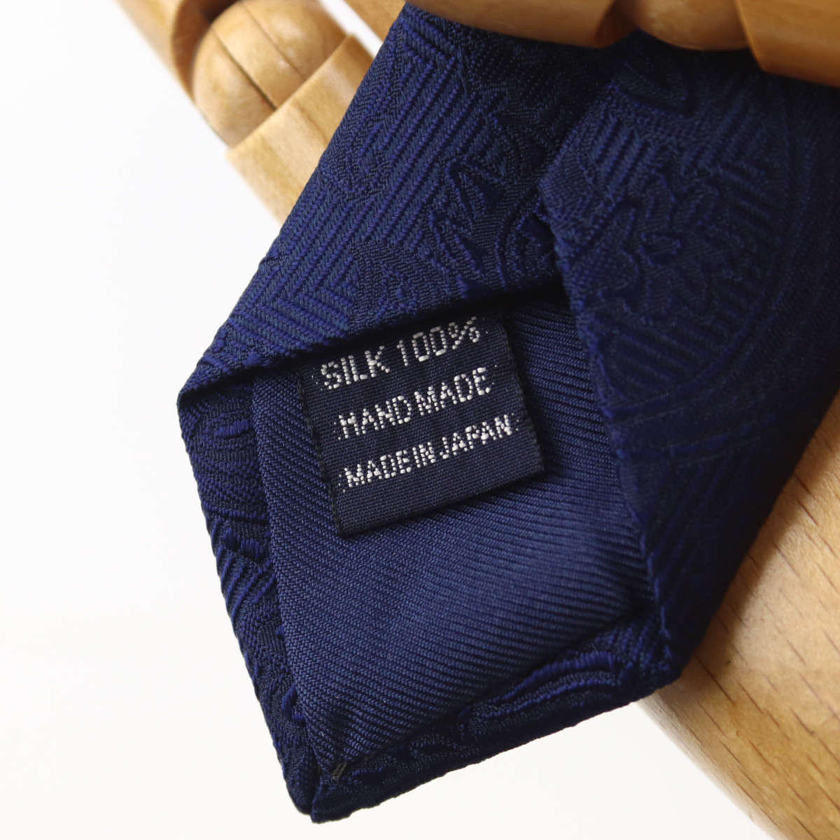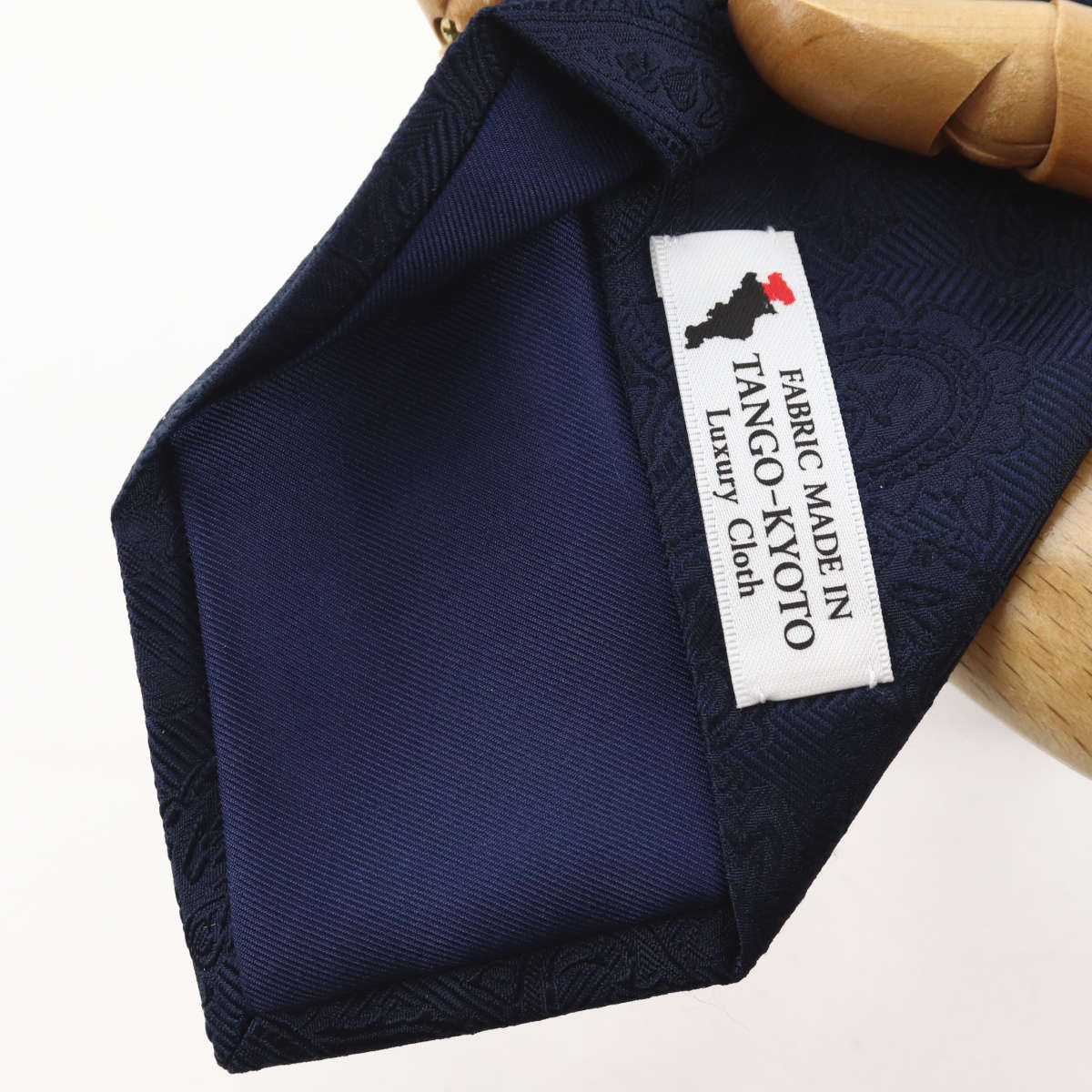| 素材特徴 | 大剣:ネイビー(濃い紺) 小剣:パープルネイビー(明るい紺) 光沢が美しい特注の最高級シルク糸を使い、京都丹後地区の旧式レピア織機でゆっくりと織り上げたこだわりの国産生地。 一般的な高速織機で織る平面的な生地と比べ、独特なハリとコシを持ち、ふっくらとした独自の風合いが魅力です。 締めやすく陰影の美しいディンプルが堪能できます。 |