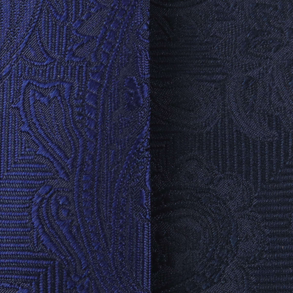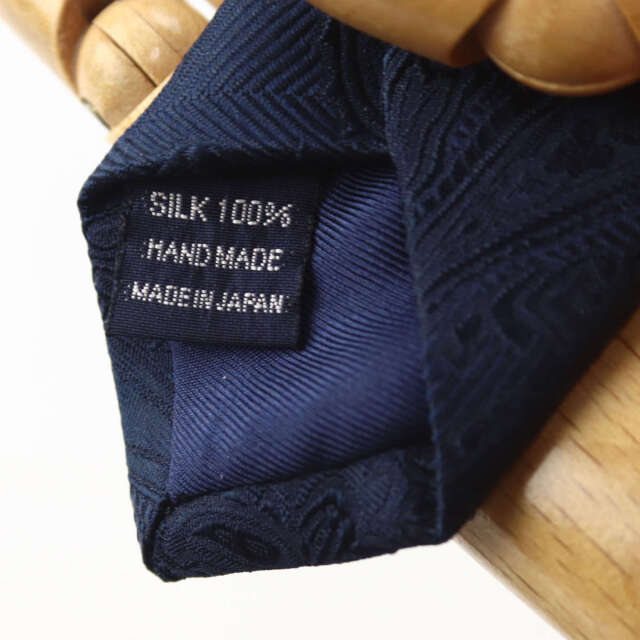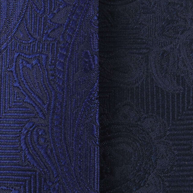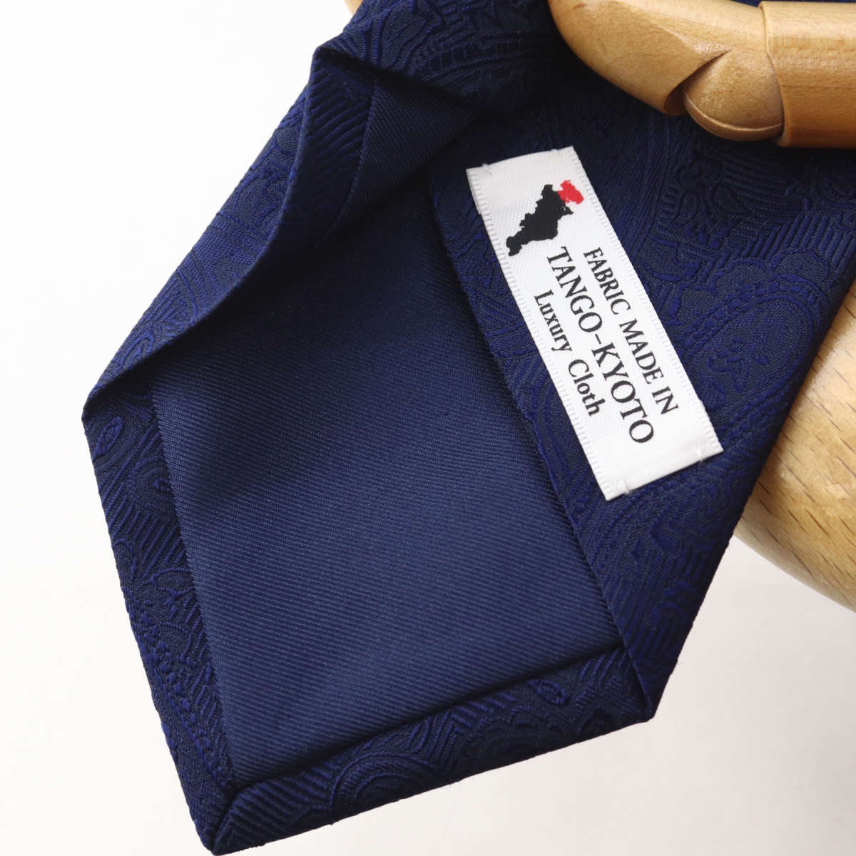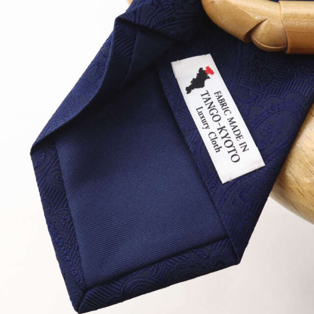 | 素材特徴 | 大剣:パープルネイビー(明るい紺) 小剣:ネイビー(濃い紺) 光沢が美しい特注の最高級シルク糸を使い、京都丹後地区の旧式レピア織機でゆっくりと織り上げたこだわりの国産生地。 一般的な高速織機で織る平面的な生地と比べ、独特なハリとコシを持ち、ふっくらとした独自の風合いが魅力です。 締めやすく陰影の美しいディンプルが堪能できます。 |