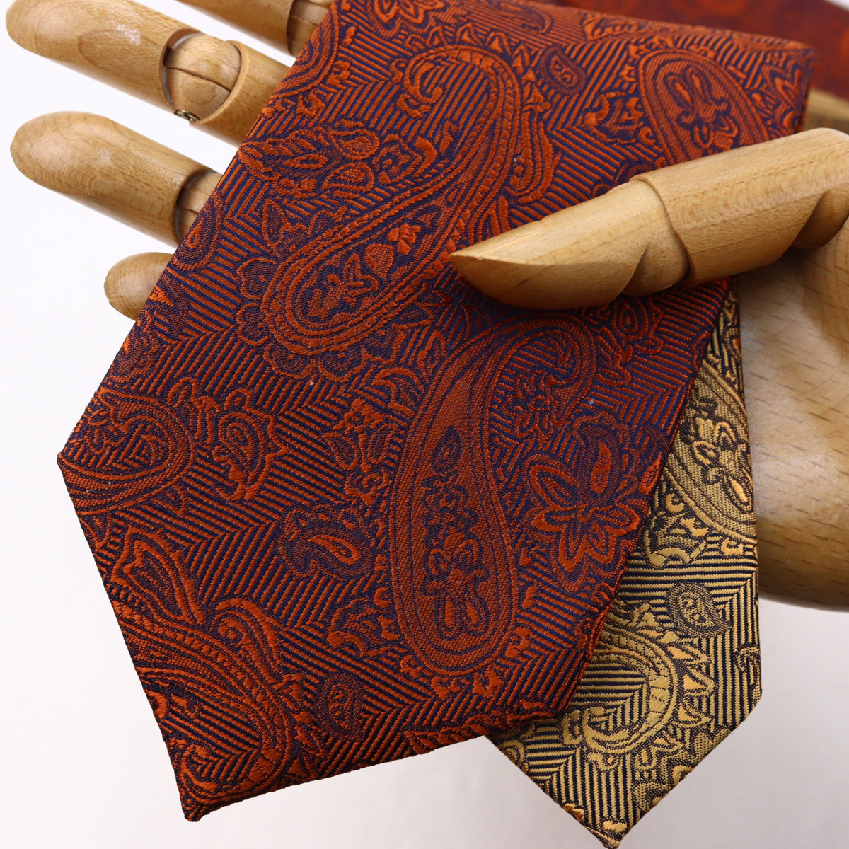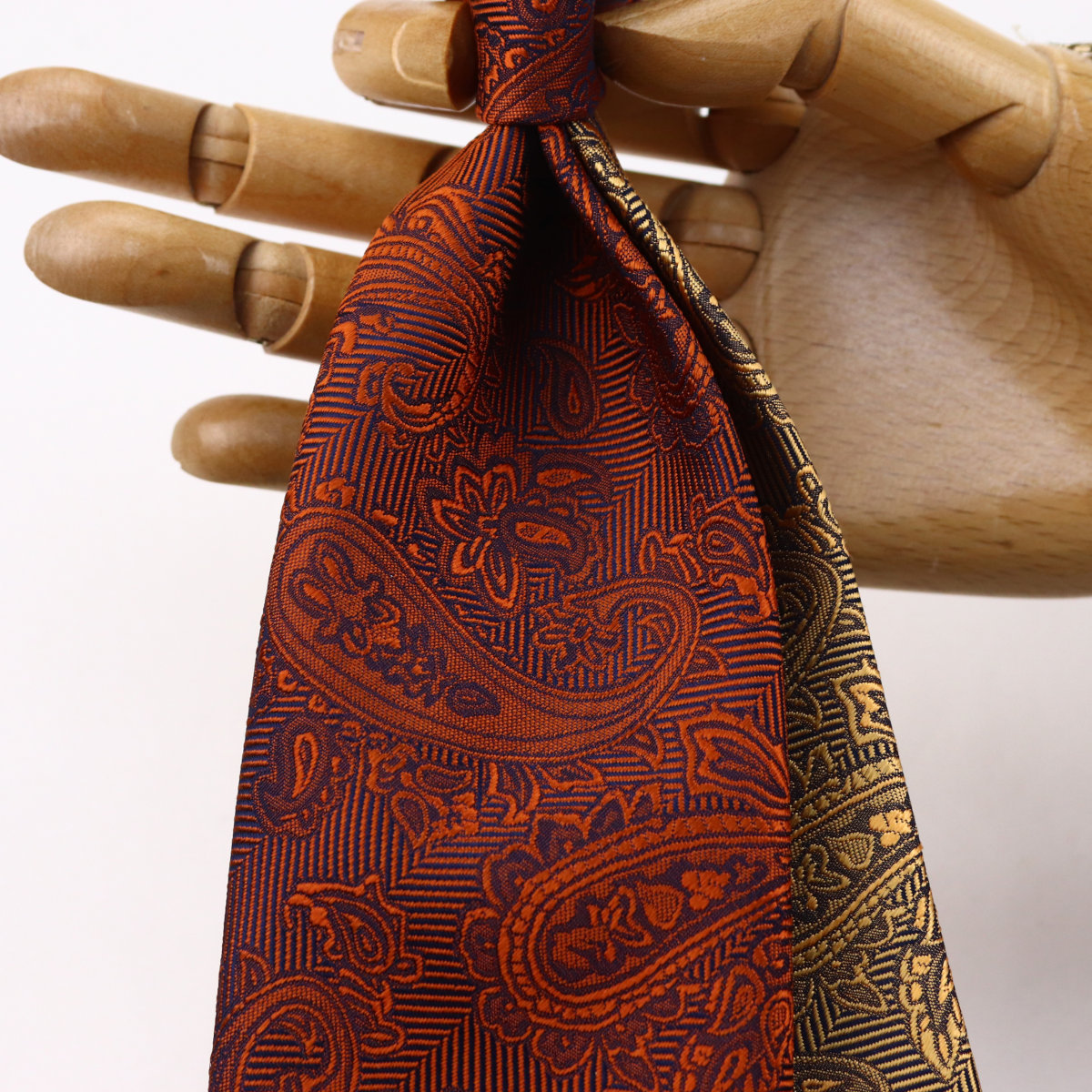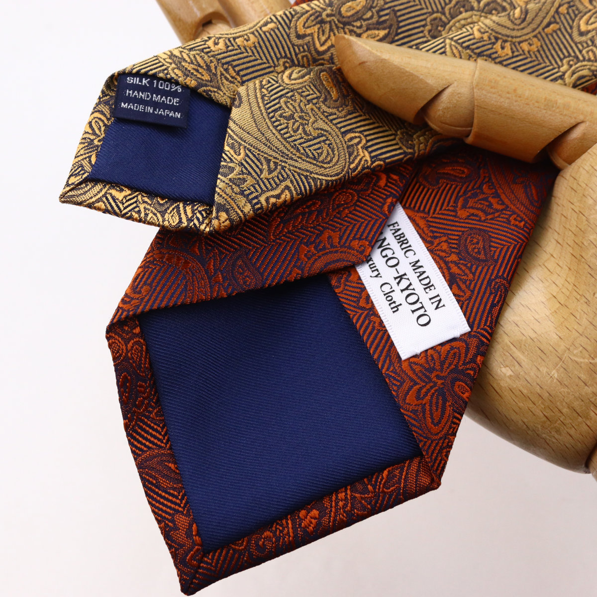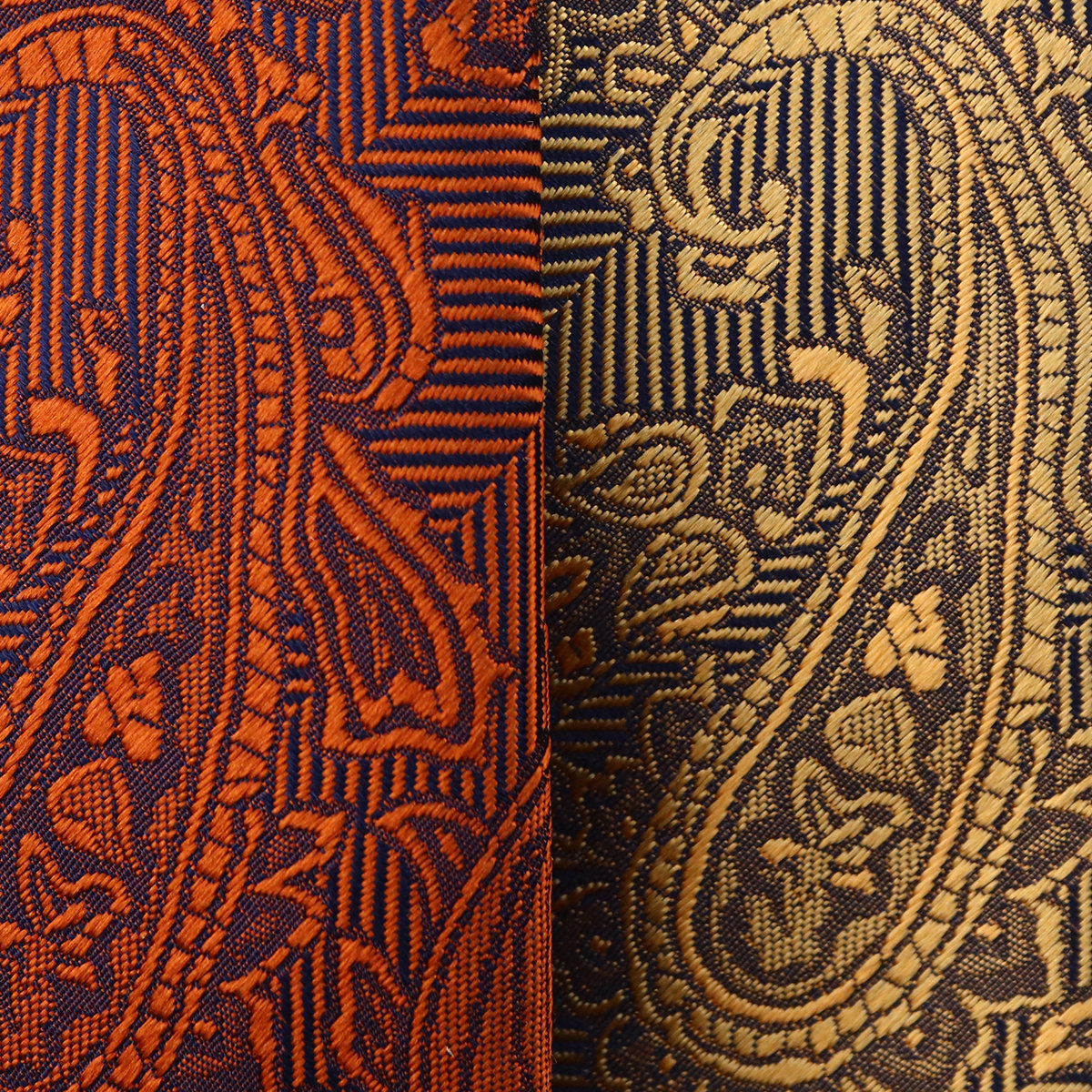 | 素材特徴 | 大剣:ディープオレンジ(赤茶がかった濃いオレンジ) 小剣:ライトオレンジ(明るい黄みのオレンジ) 光沢が美しい特注の最高級シルク糸を使い、京都丹後地区の旧式レピア織機でゆっくりと織られた拘りの国産生地。 一般的な高速織機で織る平面的な生地と比べ、独特なハリとコシを持ち、ふっくらとした独自の風合いが魅力です。 締めやすく陰影の美しいディンプルが堪能できます。 |