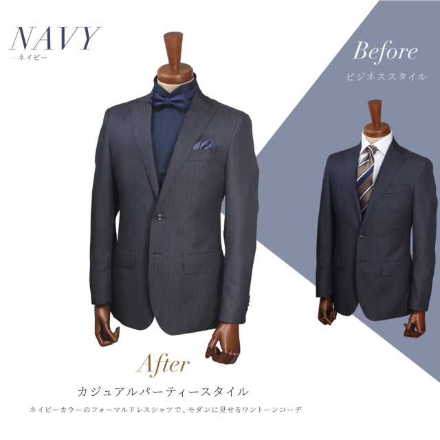 | その他 | おすすめの着こなしは、スーツとネクタイをすべてネイビーで上品にまとめたワントーンコーデ。 モダンに見せるパーティースタイルがつくれます。 ・裁断から縫製まで、すべての工程を「MADE IN JAPAN」にこだわりました。 |