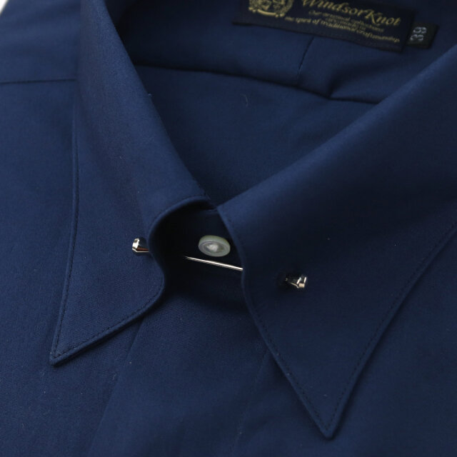| 衿型 | ピンホールカラー(カラーピン付属)/コバステッチ いまや希少な衿型になってしまった「ピンホールカラー」、ネクタイを締めた後、ノットの下に付属のピンを通すことにより、結び目を持ち上げる効果があります。 剣先:約8.5cm 衿越:約4.3cm |