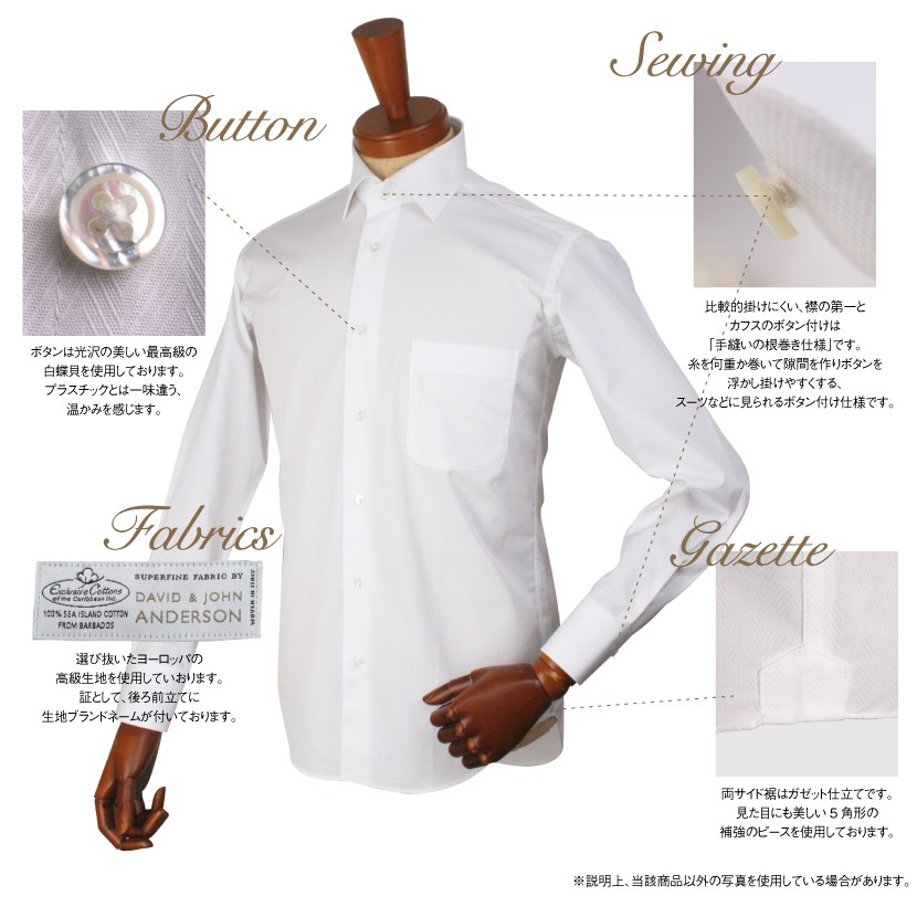 | その他 | ・襟の第一とカフスのボタン付けは手間のかかる「根巻き仕様」 ・ボタンは光沢の美しい「最高級の白蝶貝」 ・両サイド裾は「ガゼット仕立て」 5角形の補強のピース ・脇縫いは「巻き伏せ本縫い」仕様 ・選び抜いた「ヨーロッパの高級生地」、後ろ前立てに生地ブランドネームが付いております。 ※生地ブランドネームのデザインは予告なく変更になる場合がございます。 |