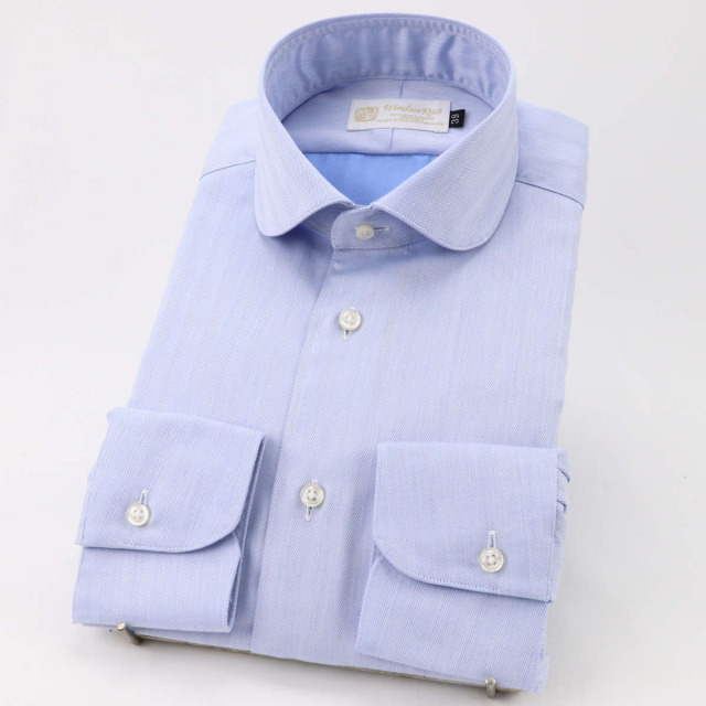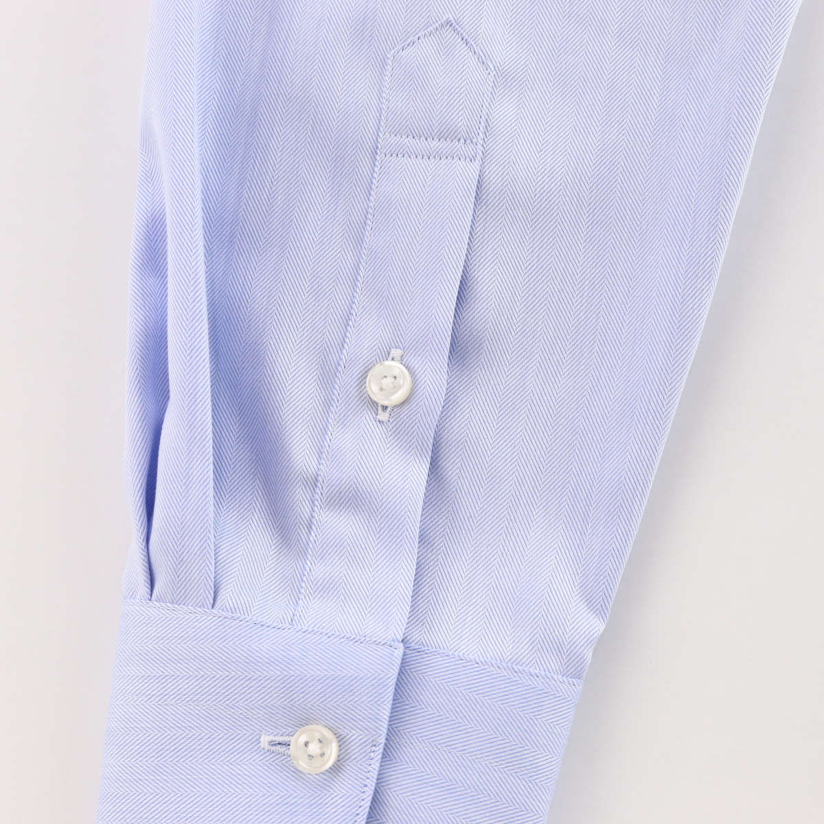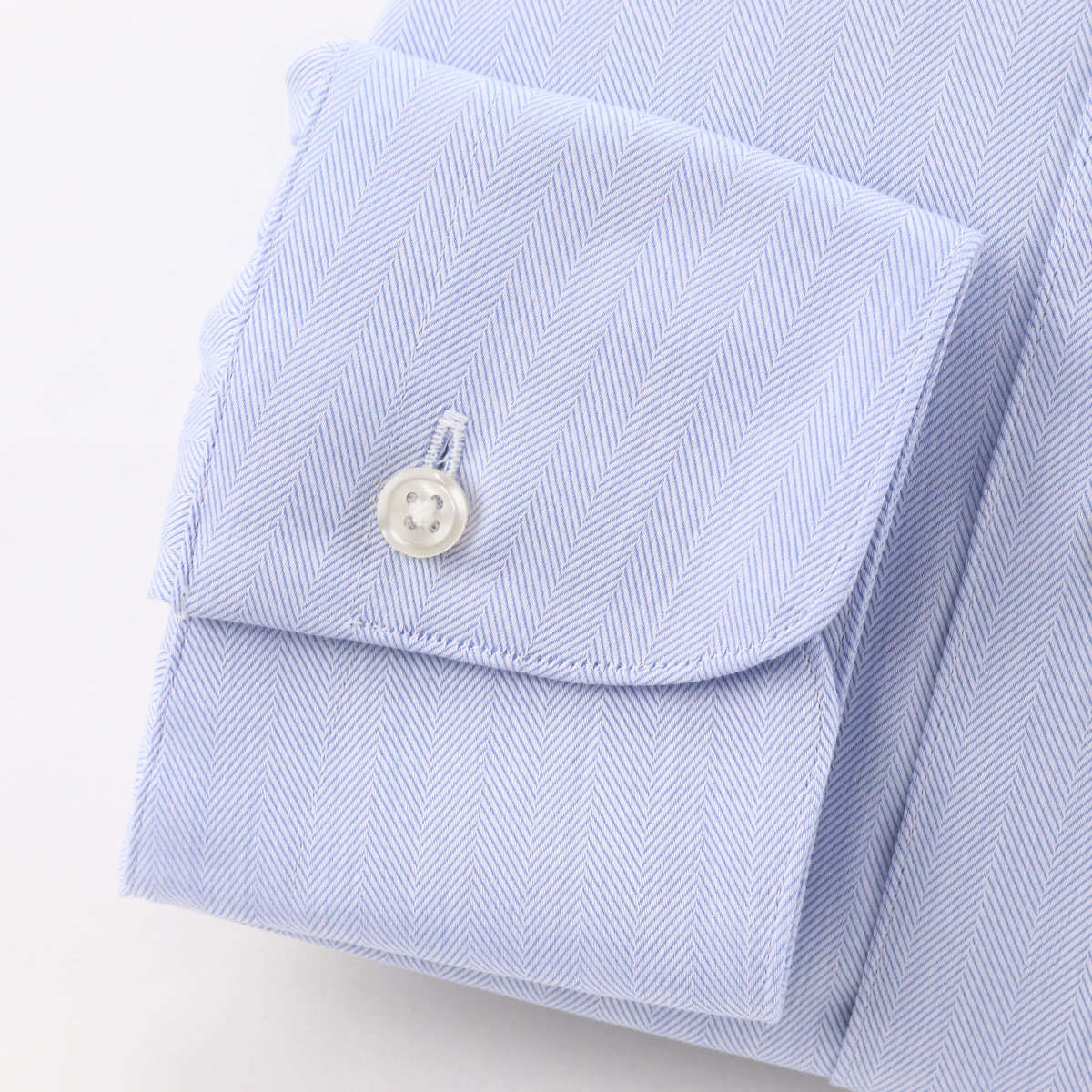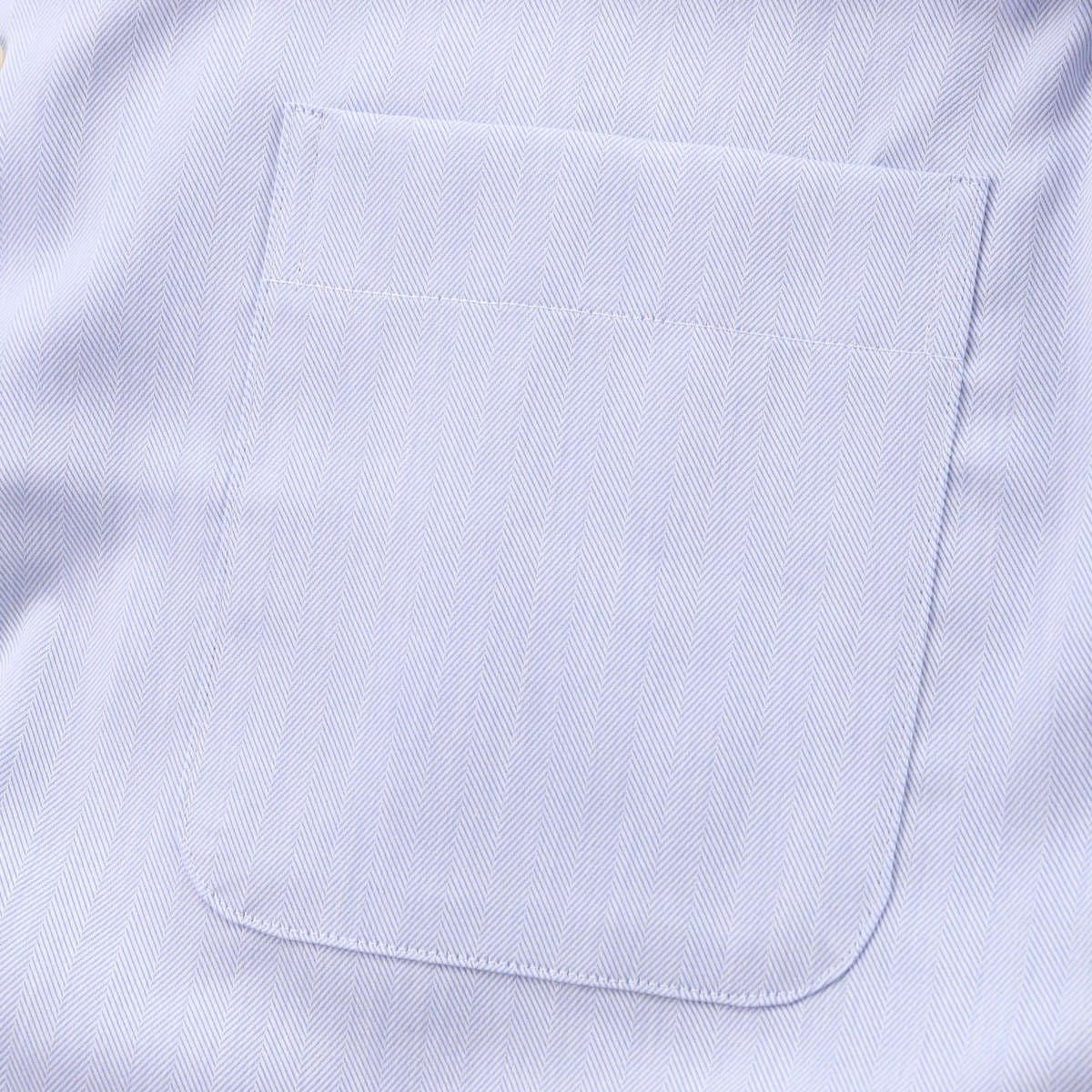| 素材特徴 | 光沢感が美しい、高番手のヘリンボーン生地を使用しています。 柔らかな質感で着心地がとても良く、シャツ生地として最適なハリとコシも持たせており、耐久性にも優れています。 さらに、手入れの簡単なイージーアイロン(イージーケア)加工を施しています。 イージーアイロンとは、綿100%の生地の風合いや着心地を損なわずに、シワになりにくい加工を施したものです。 形態安定加工よりは防シワ性は弱くなりますが、アイロンがけが簡単にでき、天然素材の風合いも生かせるため、人気があります。 |