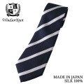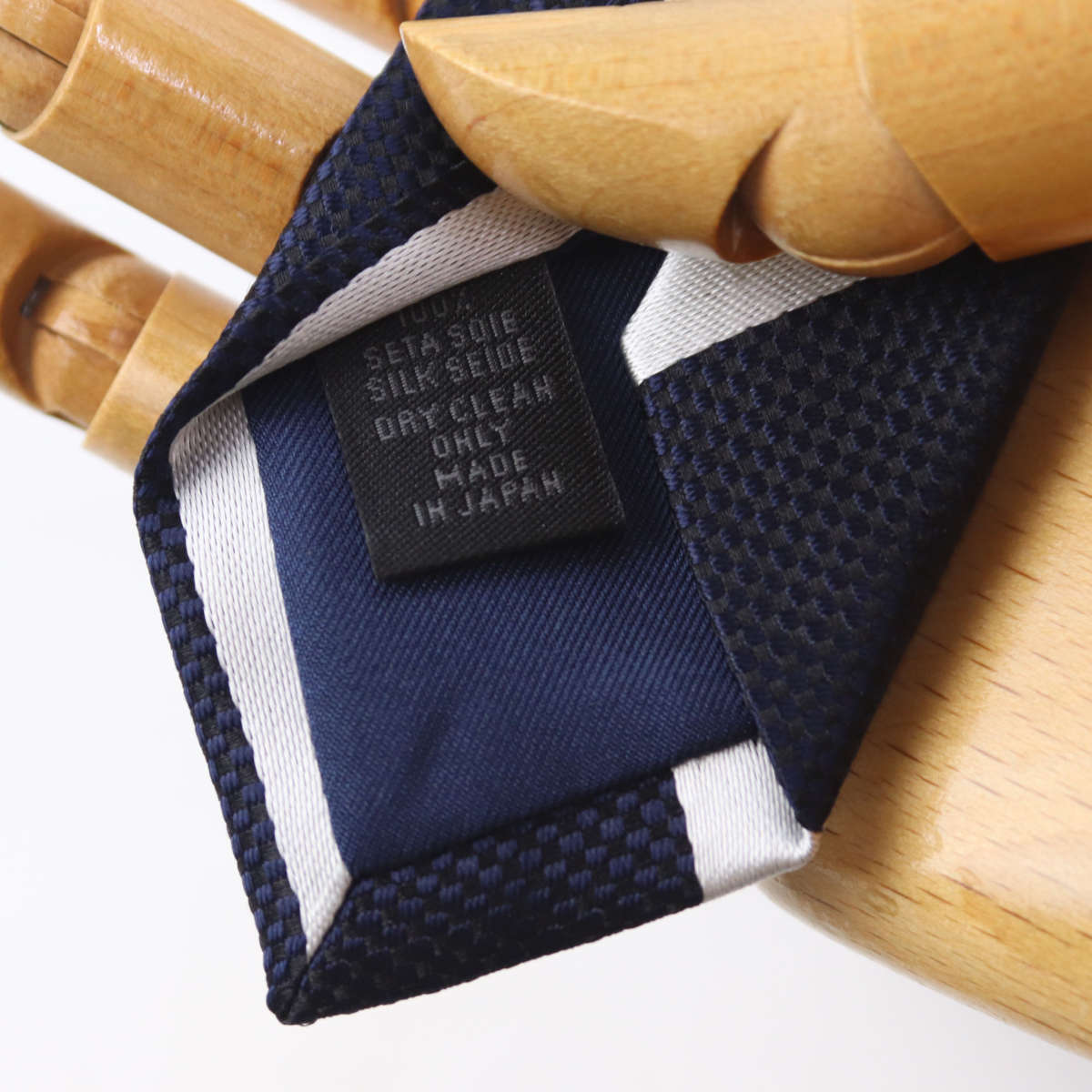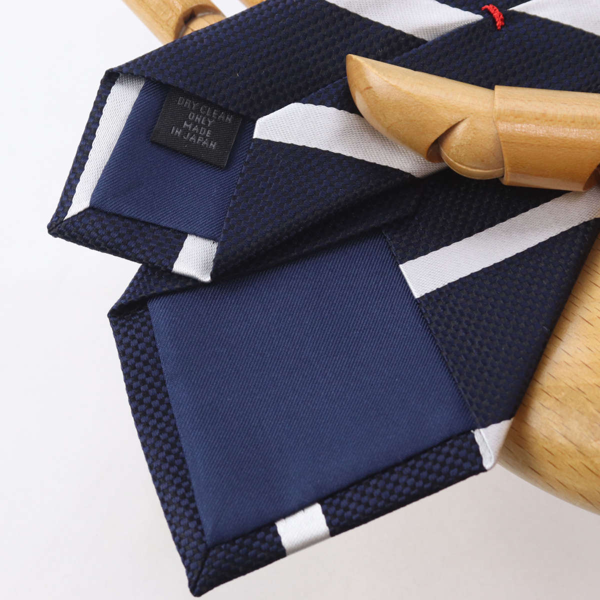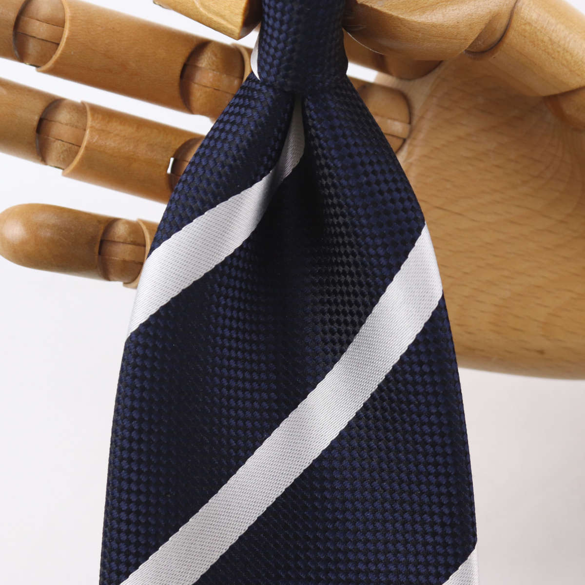 | 商品特徴 | 「洗練されたプレーンなストライプ」 凹凸のはっきりとしたバスケット織りをベースに、光沢のあるサテンのパールホワイトストライプをあしらった一本。 シンプルながらも力強い印象を与え、スーツスタイルに上品な存在感を添えます。 大人のビジネスシーンにふさわしい、洗練されたデザインです。 このネクタイは、熟練の職人が一針一針丁寧に手縫いで仕上げています。 締め心地の良さと、美しいノットをぜひお確かめください。 |