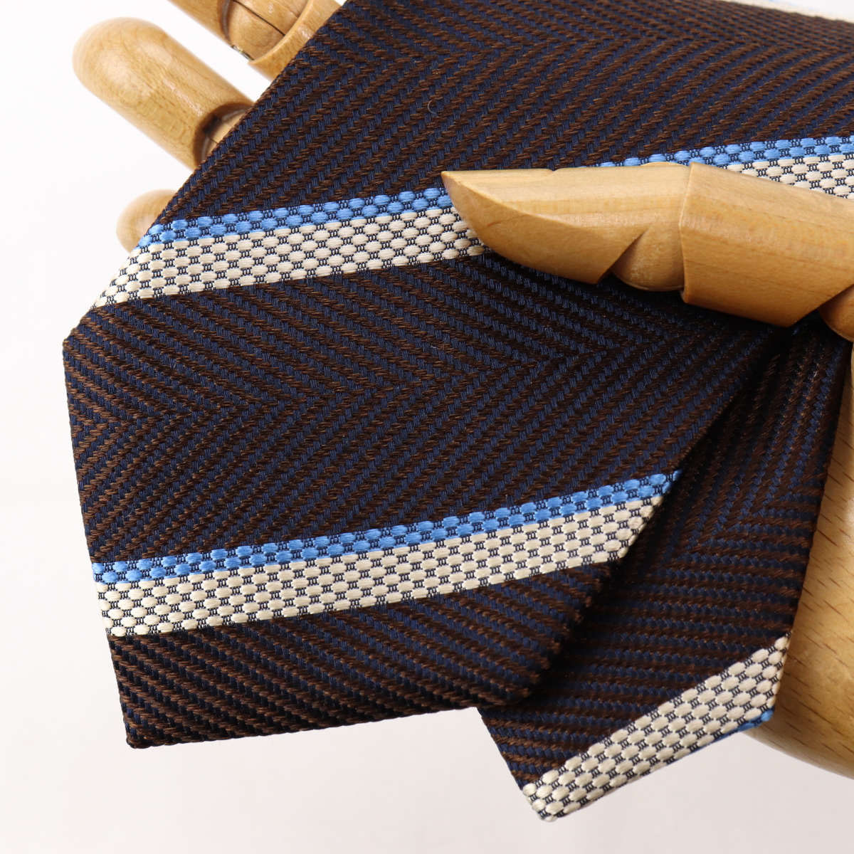 | 素材特徴 | 打ち込みの良さから生まれる弾力と、しっかりとした質感を備えた国産シルク生地。 ヘリンボーン織りとバスケット織りを組み合わせた立体感のある表情と、上質な糸による深みのある光沢が魅力です。 適度なハリとコシがあり、締めやすく、美しいディンプルをつくり出します。 |