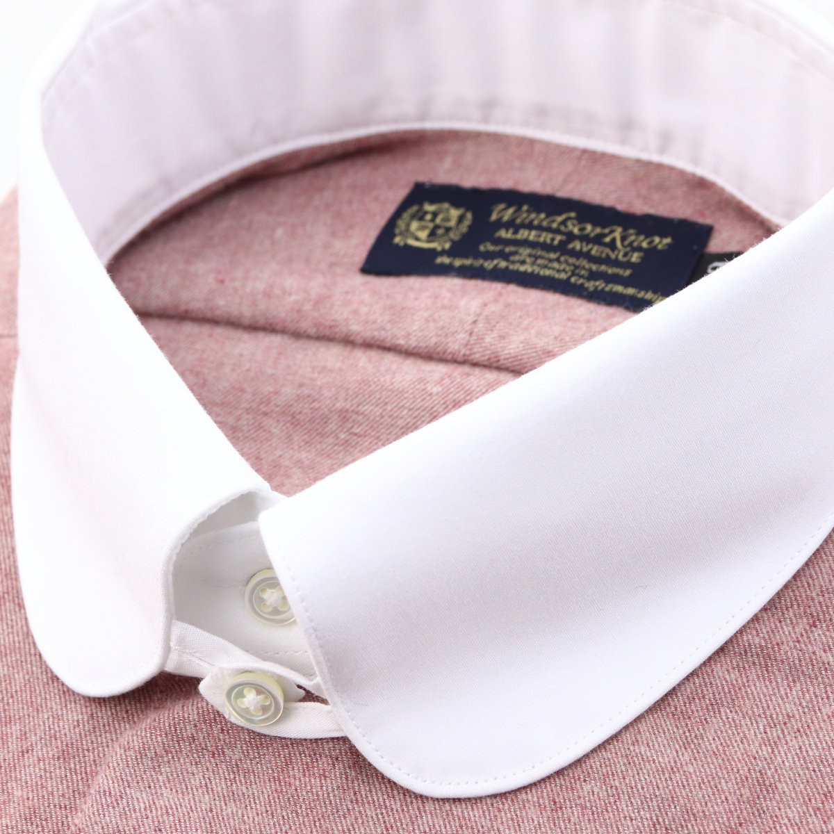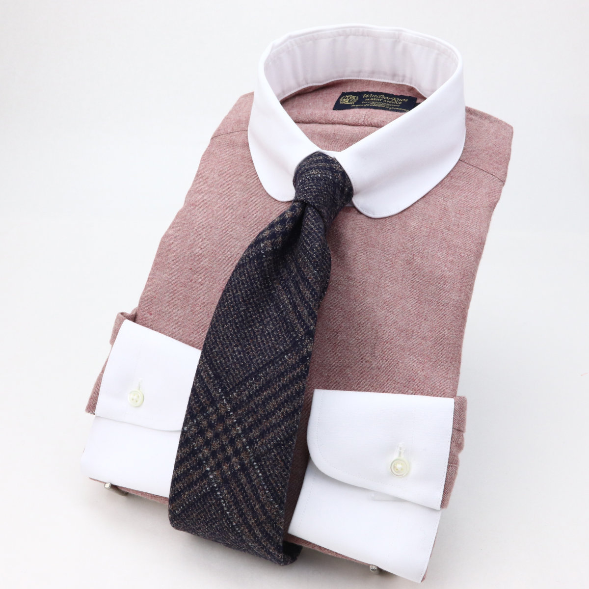 | 衿型 | ラウンドタブカラー/コバステッチ クラシックな表情が魅力の「ラウンドタブカラー」、ネクタイを締めた後、ノットの下でタブの両端を連結し、結び目を持ち上げる効果があります。 タブの連結はボタン留めです。 剣先:約-cm 衿越:約4.2cm |