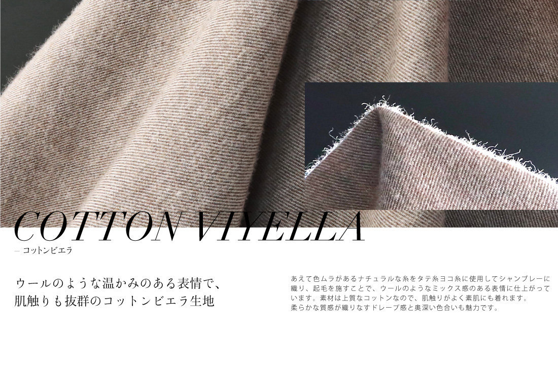 | 素材特徴 | ボディ・・・ピンクベージュ、コットンビエラ 衿、カフス・・・白無地、ブロード ボディに、ウールのような温かみのある表情で、肌触りも抜群のコットンビエラ生地を使用しました。 ドレープ感がある柔らかな薄手の起毛素材なので高級感がありとても上品です。 |