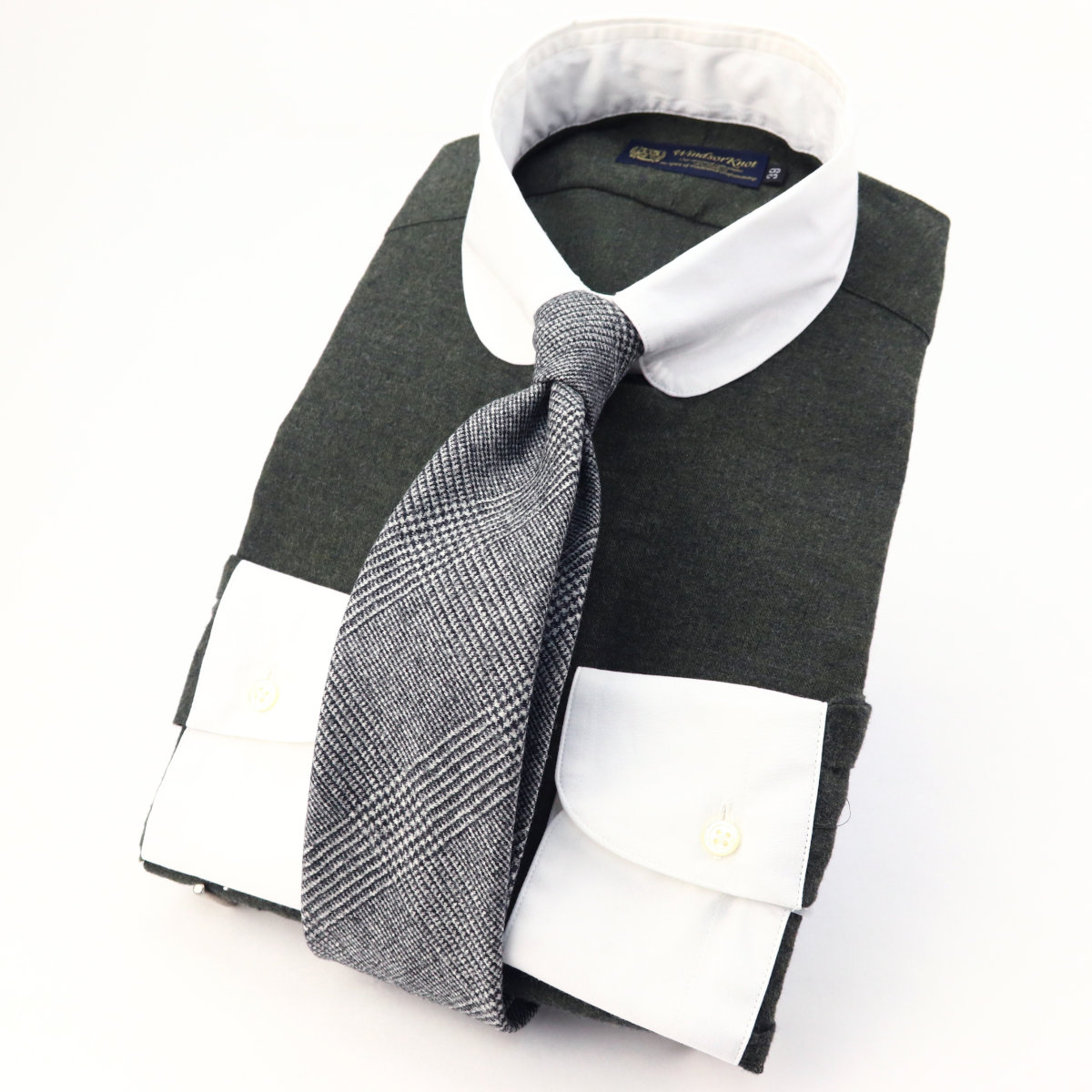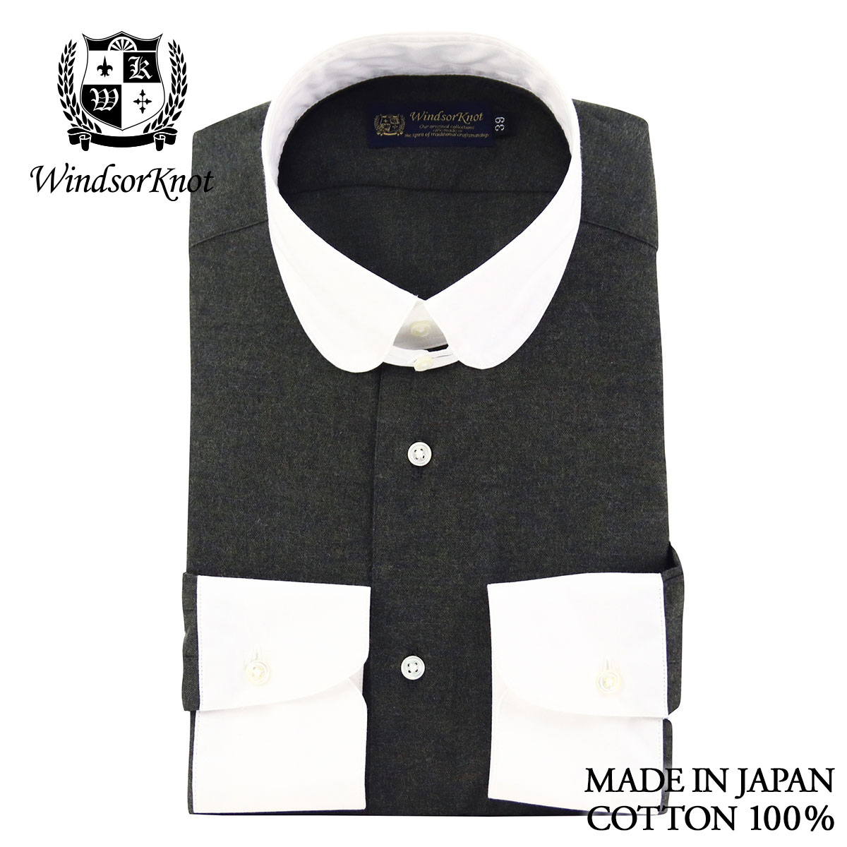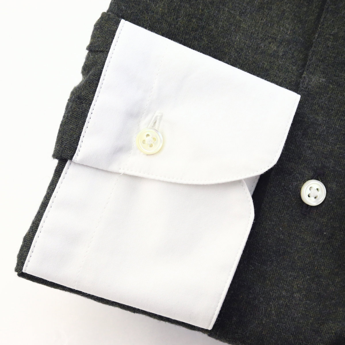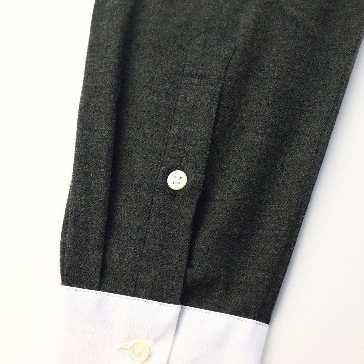 | 素材特徴 | ボディ・・・暗いオリーブグリーン、コットンビエラ 衿、カフス・・・白無地、ブロード ボディに、ウールのような温かみのある表情で、肌触りも抜群のコットンビエラ生地を使用しました。 ドレープ感がある柔らかな薄手の起毛素材なので高級感がありとても上品です。 衿とカフスは、コットンビエラの風合いに合わせて、ソフトな芯地を使い柔らかく仕立てたブロード生地です。 優しい肌触りで着心地も抜群です。 |