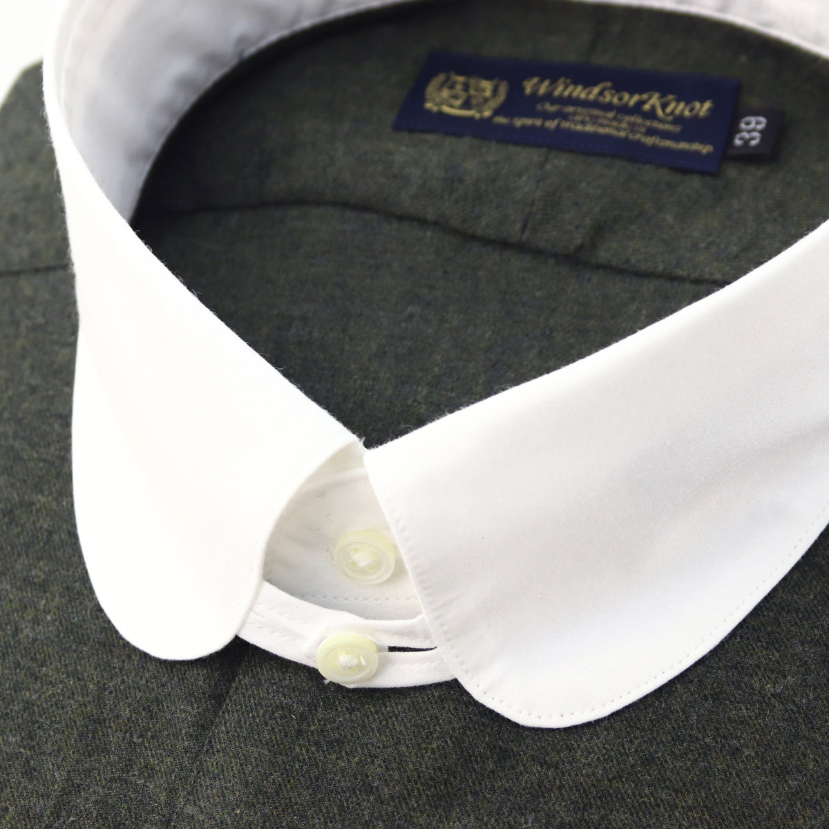 | 衿型 | ラウンドタブカラー/コバステッチ 柔らかな衿(ソフトな芯地)を使用。 クラシックな表情が魅力の「ラウンドタブカラー」、ネクタイを締めた後、ノットの下でタブの両端を連結し、結び目を持ち上げる効果があります。 タブの連結はボタン留めです。 剣先:約-cm 衿越:約4.2cm |