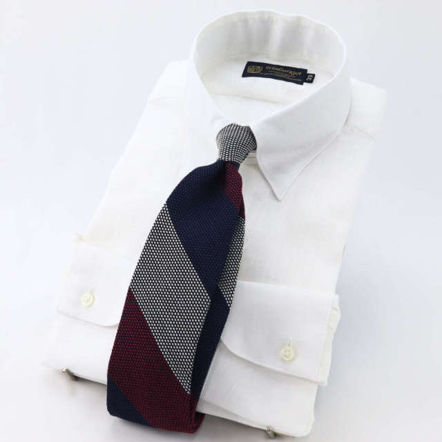 | 衿型 | タブカラー/コバステッチ いまや希少な衿型になってしまった「タブカラー」、ネクタイを締めた後、ノットの下でタブの両端を連結し、結び目を持ち上げる効果があります。 タブの連結はボタン留めです。 剣先:約8cm 衿越:約4.3cm |