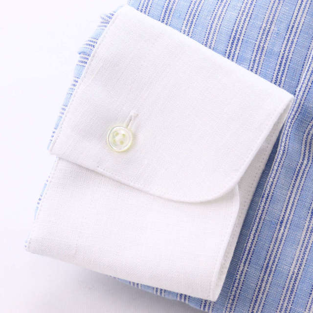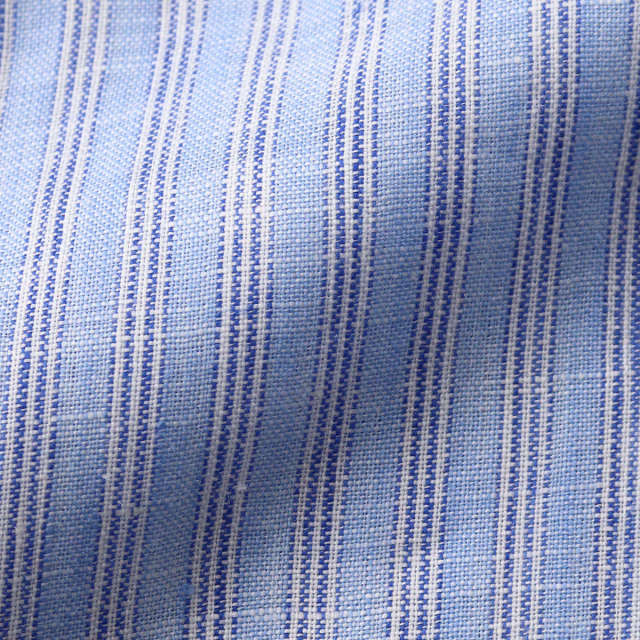 | 素材特徴 | ボディ・・・スカイブルー×ネイビー×白 地付きストライプ(リネン) 衿、カフス・・・白無地(リネン) リネンの中でも最高級とされるフレンチリネンを厳選して使用しています。柔らかな肌触りと高い通気性があり、素肌に直接触れても快適な、ドレスシャツに最適なリネン生地です。 また、高品質なリネンならではの自然な光沢と心地よいひんやり感をお楽しみいただけます。風に揺れる独特の「たぷん」とした涼しげな風合いも魅力の一つです。 このリネン生地は、実用的な清涼感と洗練された上品さを兼ね備えています。 |