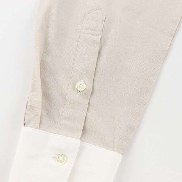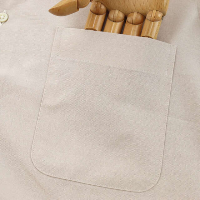 | 素材特徴 | ボディ・・・ベージュ(ダンガリー) 襟、カフス・・・白(ダンガリー) 独特のムラ感と奥行きのある粗野な風合いが魅力のダンガリー生地を使用しています。 ダンガリーはデニムのように丈夫で長く愛用でき、デニムよりも薄く軽いため、体に馴染む経年変化を楽しめます。カジュアルアイテムの素材として最適であるだけでなく、ドレスアイテムにカジュアルな印象を加えることもできる、ユーティリティな素材です。 時代と共にあらゆるシーンで活躍するダンガリーの新たな一面をお見せできれば幸いです。 |