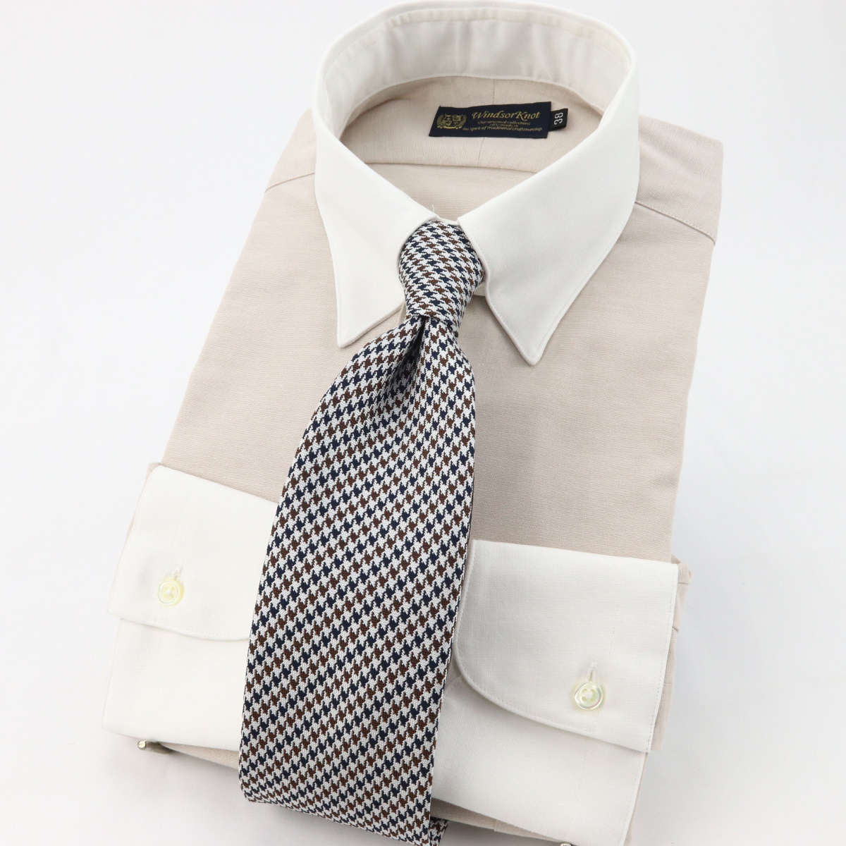 | 衿型 | タブカラー/コバステッチ いまや希少な衿型になってしまった「タブカラー」、ネクタイを締めた後、ノットの下でタブの両端を連結し、結び目を持ち上げる効果があります。 タブの連結はボタン留めです。 剣先:約8.5cm 衿越:約4.3cm |