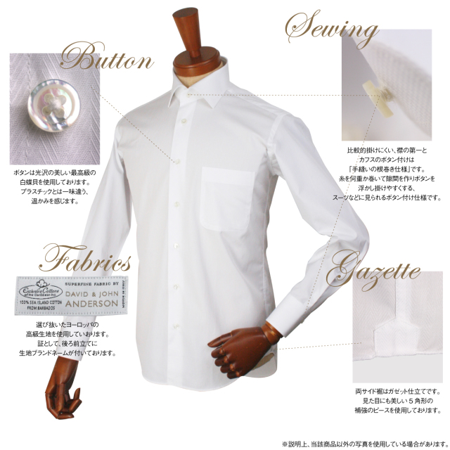 | その他 | ・襟の第一とカフスのボタン付けは手間のかかる「根巻き仕様」 ・ボタンは光沢の美しい「最高級の白蝶貝」 ・両サイド裾は「ガゼット仕立て」5角形の補強のピース ・脇縫いは「巻き伏せ本縫い」仕様 ・選び抜いた「ヨーロッパの高級生地」 証として、後ろ前立てに生地ブランドネームが付いております。 |