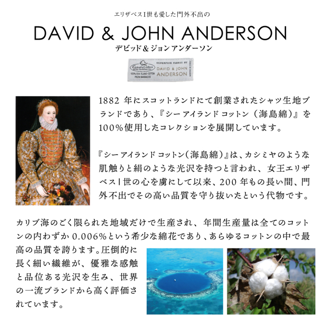 | 素材特徴 | DAVID & JOHN ANDERSON (デビッド&ジョンアンダーソン) 1882年にスコットランドにて創業されたシャツ生地ブランドであり、『シーアイランドコットン』を100%使用したコレクションを展開しています。 『シーアイランドコットン』は、カシミヤのような肌触りと絹のような光沢を持つと言われ、女王エリザベス1世の心を虜にして以来、200年もの長い間、門外不出でその高い品質を守り抜いたという代物です。 カリブ海のごく限られた地域だけで生産され、年間生産量は全てのコットンの内わずか0.006%という希少な綿花であり、あらゆるコットンの中で最高の品質を誇ります。圧倒的に長く細い繊維が、優雅な感触と品位ある光沢を生み、世界の一流ブランドから高く評価されています。 |