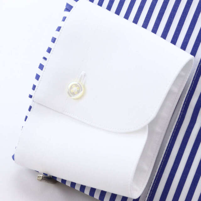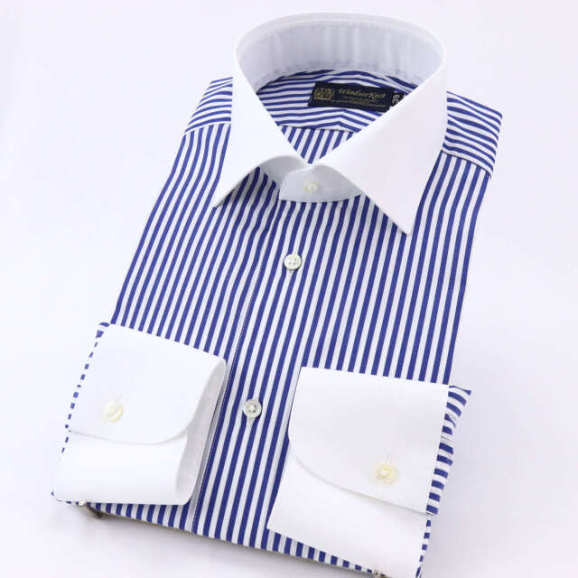 | 素材特徴 | ボディ、カフス・・・紺×白ロンドンストライプ 衿、カフス・・・白無地、ブロード 「上質な素材にこだわった英国調ストライプ」 上品なロンドンストライプ柄(約3mm幅のストライプ)を、120番手の双糸ポプリン生地に使用しています。 非常に細い糸を高密度に織り込むことで、シャツ地として適切なハリとコシを持ち、シルクのような滑らかな肌触りを実現しています。 番手とは、糸の細さを示す単位で、数字が大きくなるほど、より細く高級になります。一般的に、80番手以上は高級素材とされています。 |