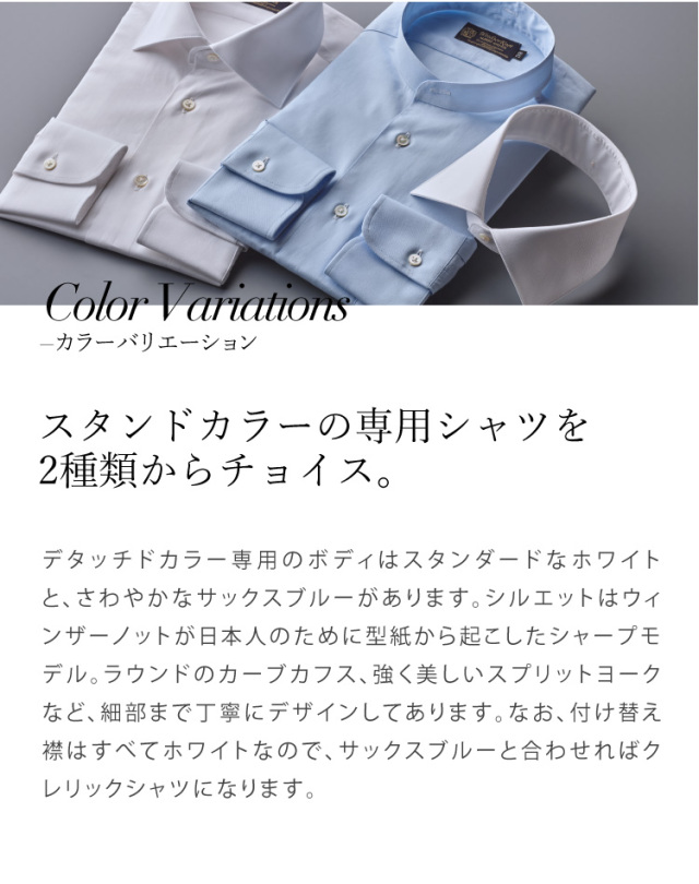 | 商品特徴 | 「DETACHED COLLAR SHIRT」 1900~1930年代頃に大流行した襟が着脱可能なドレスシャツ、 「デタッチドカラーシャツ」をWindsorKnotで現代的に復刻しリリースいたしました。 7種類の「付け替え襟」と2色の「ボディ」をご用意しております。 様々な襟型を付け替えて楽しむ、当時の紳士ファッションのスタイルをご体感ください。 ※こちらの商品はデタッチドカラー(付け替え襟)シャツの専用ボディです。 別売りの(付け替え襟)と組み合わせてご着用ください。 |